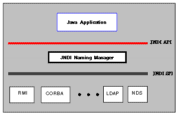 The JNDI architecture consists of the JNDI API and the JNDI SPI. The JNDI API allows Java applications to access a variety of naming and directory services. The JNDI SPI is designed to be used by arbitrary service providers including directory service providers. This enables a variety of directory and naming services to be plugged in transparently to the Java application (which uses only the JNDI API). The JNDI Architecture figure shows the JNDI architecture and includes a few service providers of directory and naming contexts as examples.